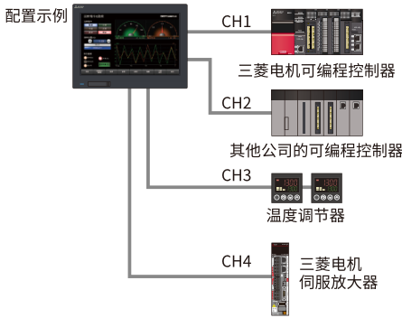1臺(tái)GOT最多可控制4個(gè)通道的FA機(jī)器(可編程控制器、伺服、變頻器、溫度調(diào)節(jié)器等)。